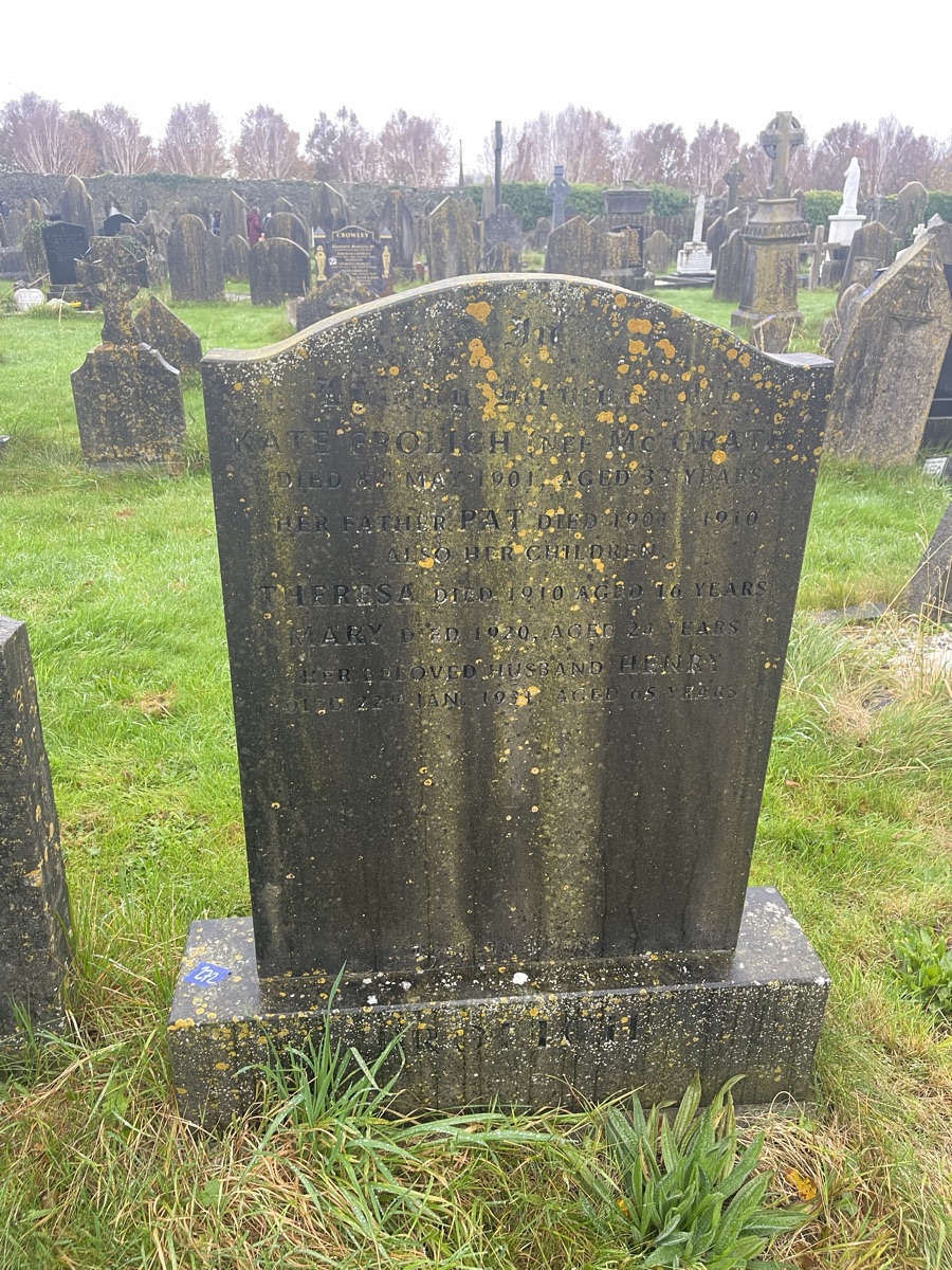 In loving memory of Kate Frolich (nee McGrath) died 8th of May 1901 aged 38 years. Her father Pat died 1901 - 1910, also her children Theresa died 1910 aged 16, Mary died 1920 aged 24 years. Her beloved husband Henry died 22nd Jan 1931 aged 65 years. Rest in Peace.