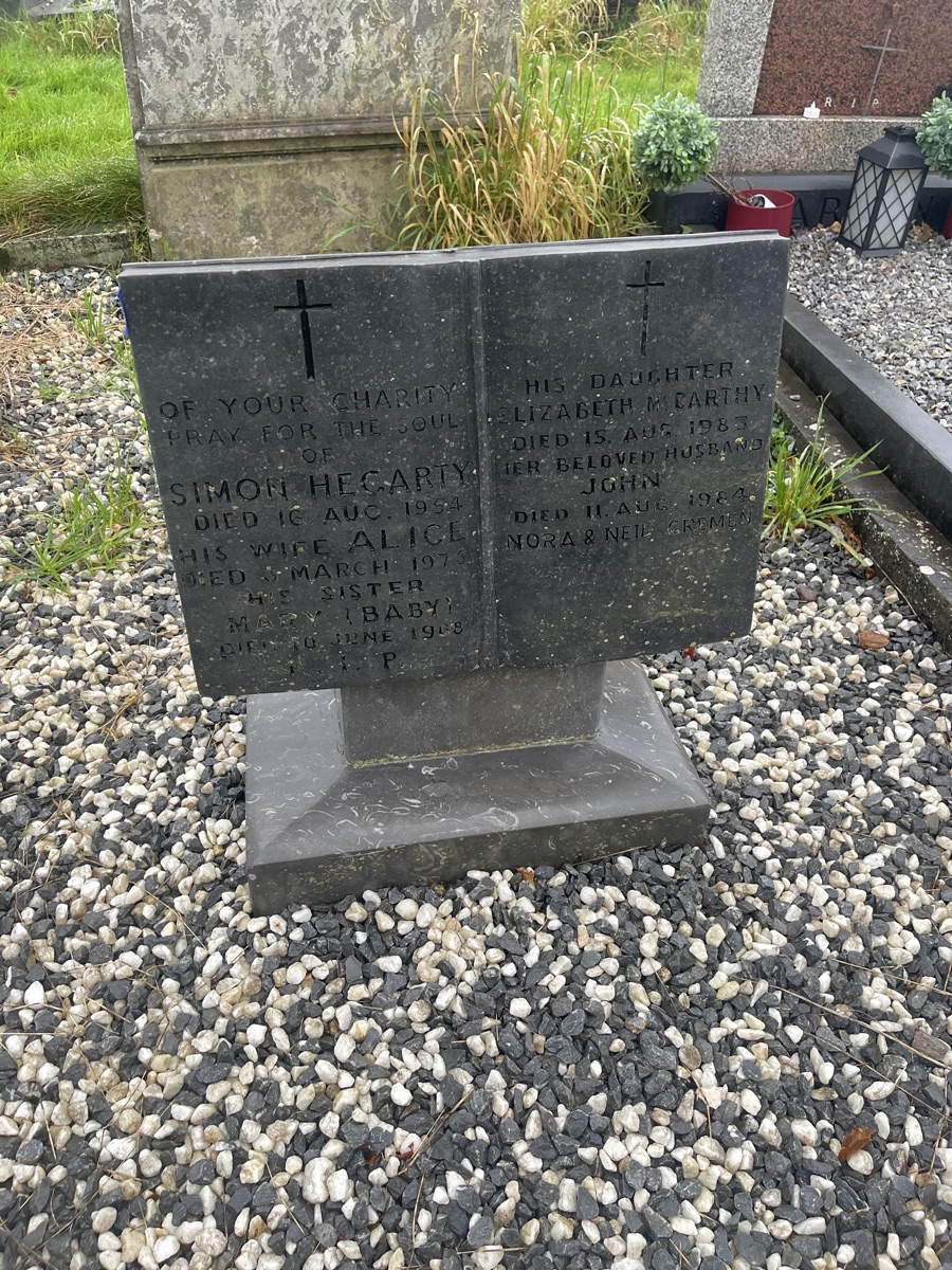 OF YOUR MEMORY PRAY FOR THE SOUL OF SIMON HEGARTY DIED 16 AUG 1954 HIS WIFE ALICE DIED 3 MARCH 1975 HIS SISTER MARY (BABY) DIED 10 JUNE 1968 R.I.P. HIS DAUGHTER ELIZABETH MCCARTHY DIED 15 AUG 1983 HER BELOVED HUSBAND JOHN DIED 1 AUG 1934 NORA CREMEN NEIL CREMEN