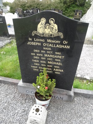 In loving memory ofJoseph O'Callaghan, Nadddied 9th Oct. 1962His wife Margaretdied 15th Dec. 1968Their son Michaeldied 16th May 1993Their daughter Abinadied 22nd Sept 1998