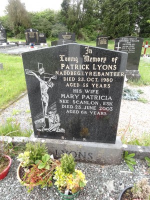 In loving memory ofPatrick Lyons, Naddbeg, Lyre, Banteerdied 23. Oct. 1980 aged 55 yearsHis wife Mary Patricia nee Scanlon, Eskdied 23. June 2003 aged 68 years