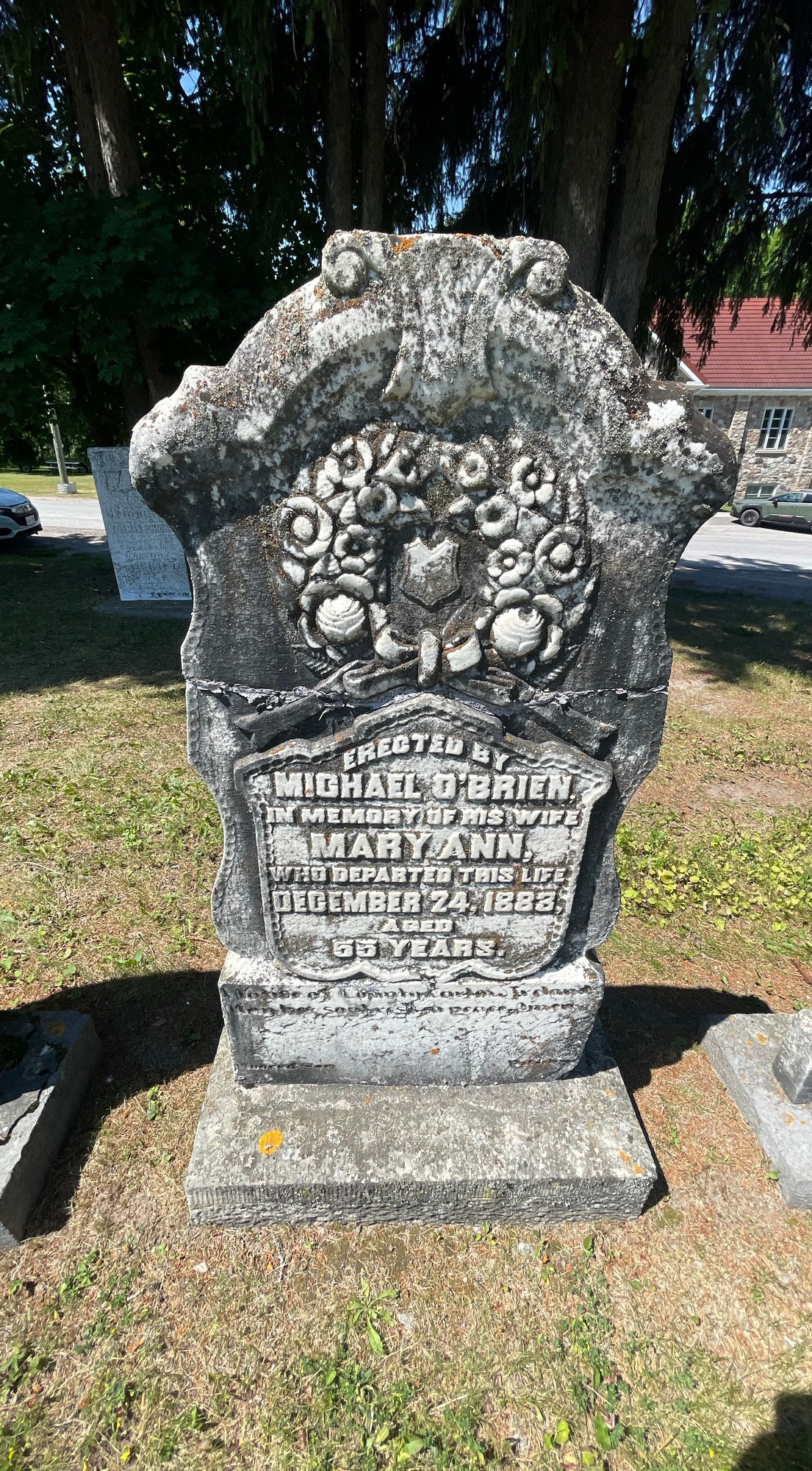 ERECTED BY MICHAEL O'BRIEN IN MEMORY OF HIS WIFE MARY ANN WHO DEPARTED THIS LIFE DECEMBER 24, 1883 AGED 55 YEARS A native of County Carlow Ireland May her soul rest in peace Amen.