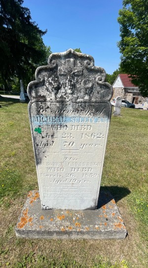 In memory of MICHEAL SULLIVAN WHO DIED Aug. 23, 1862: Aged 70 years. May his soul rest in peace Amen. Also MARGRET CAVANAGH WHO DIED March 26, 1859: Aged 19 yrs. May her soul rest in peace Amen.