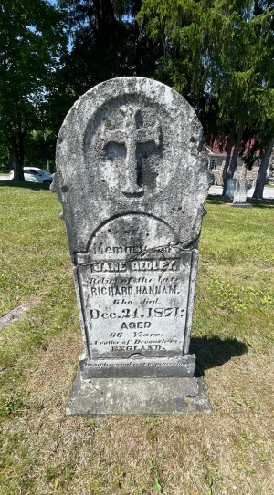 In Memory of JANE GEDLEY, Relict of the late RICHARD HANNAM, who died Dec. 24, 1871: AGED 66 Years. A native of Devonshire, ENGLAND. May her soul rest in peace Amen.