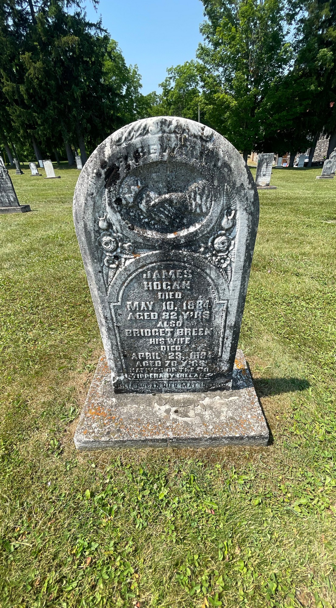 JAMES HOGAN DIED MAY 10, 1882 AGED 84 YRS ALSO BRIDGET BREEN HIS WIFE DIED APRIL 23, 1884 AGED 70 YRS NATIVES OF THE CO. TIPPERARY IRELAND JULIA HOGAN DIED MAy 15