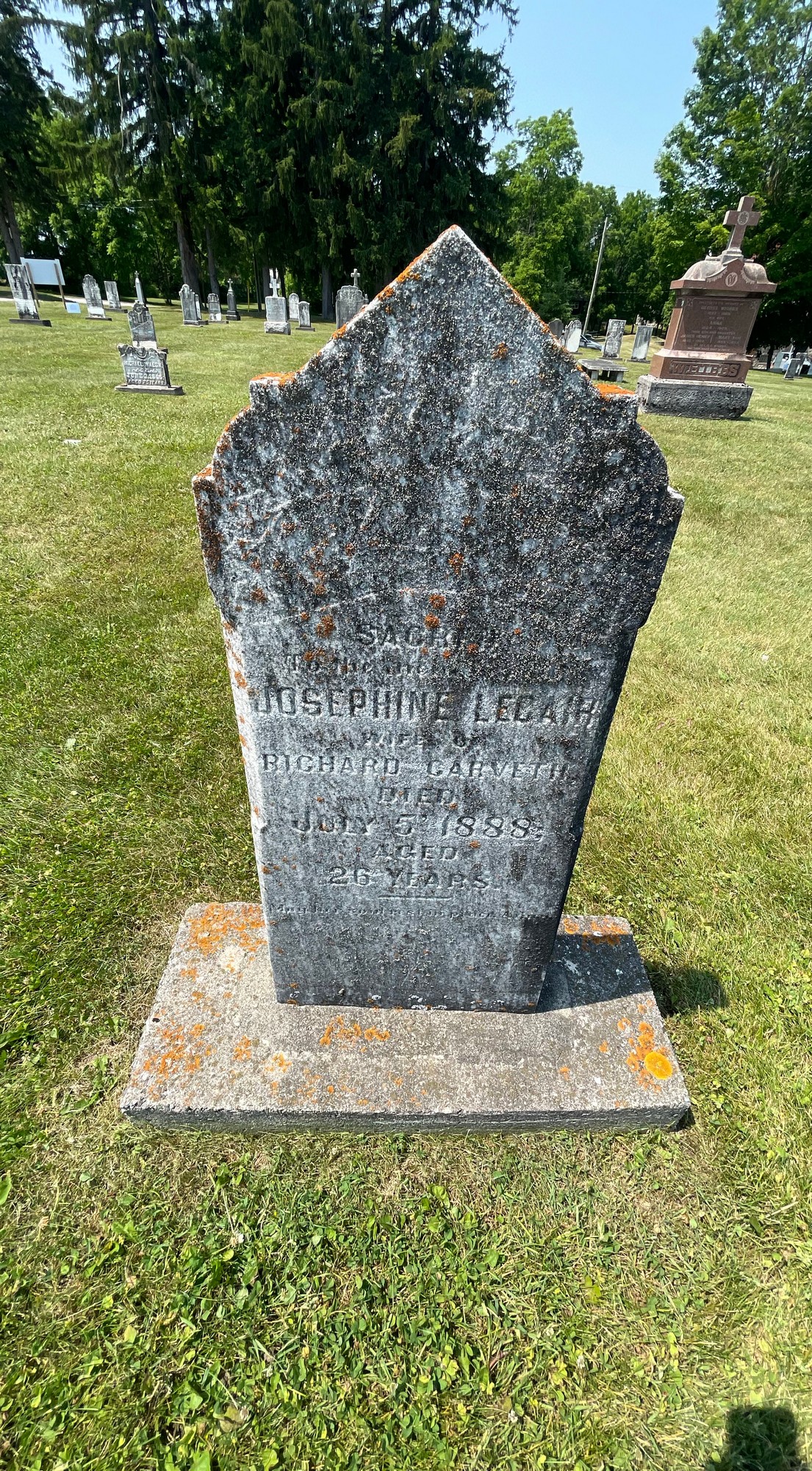 SACRED TO THE MEMORY OF JOSEPHINE LECAIR WIFE OF RICHARD CARVETH DIED JULY 5 1888 AGED 26 YEARS MAY HER SOULS REST IN PEACE AMEN