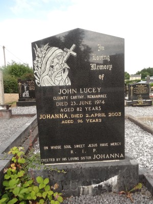 In Loving Memory of JOHN LUCEYClounty Carthy, RenanirreeDied 23. June 1974aged 82 yearsJOHANNA, died 2. April 2003aged 96 years