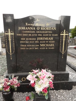 InLoving Memory ofJOHANNA O'RIORDANCahirdahy, Kilnamartyrawho died 8th June 1968, aged 81 yearsher husband JEREMIAHdied 2nd July 1983, aged 93 yearstheir son-in-law MICHAELdied 1st July 2007, aged 81 years