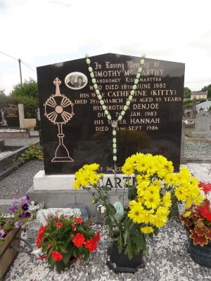 In Loving Memory ofTIMOTHY MCCARTHYCandromey, Kilnamartyrawho died 18th June 1982His wife CATHERINE (KITTY) died 29th March 2009 aged 93 yearsHis brother DEN JOEdied 7th Jan. 1983His sister HANNAHDied 25th Sept. 1986