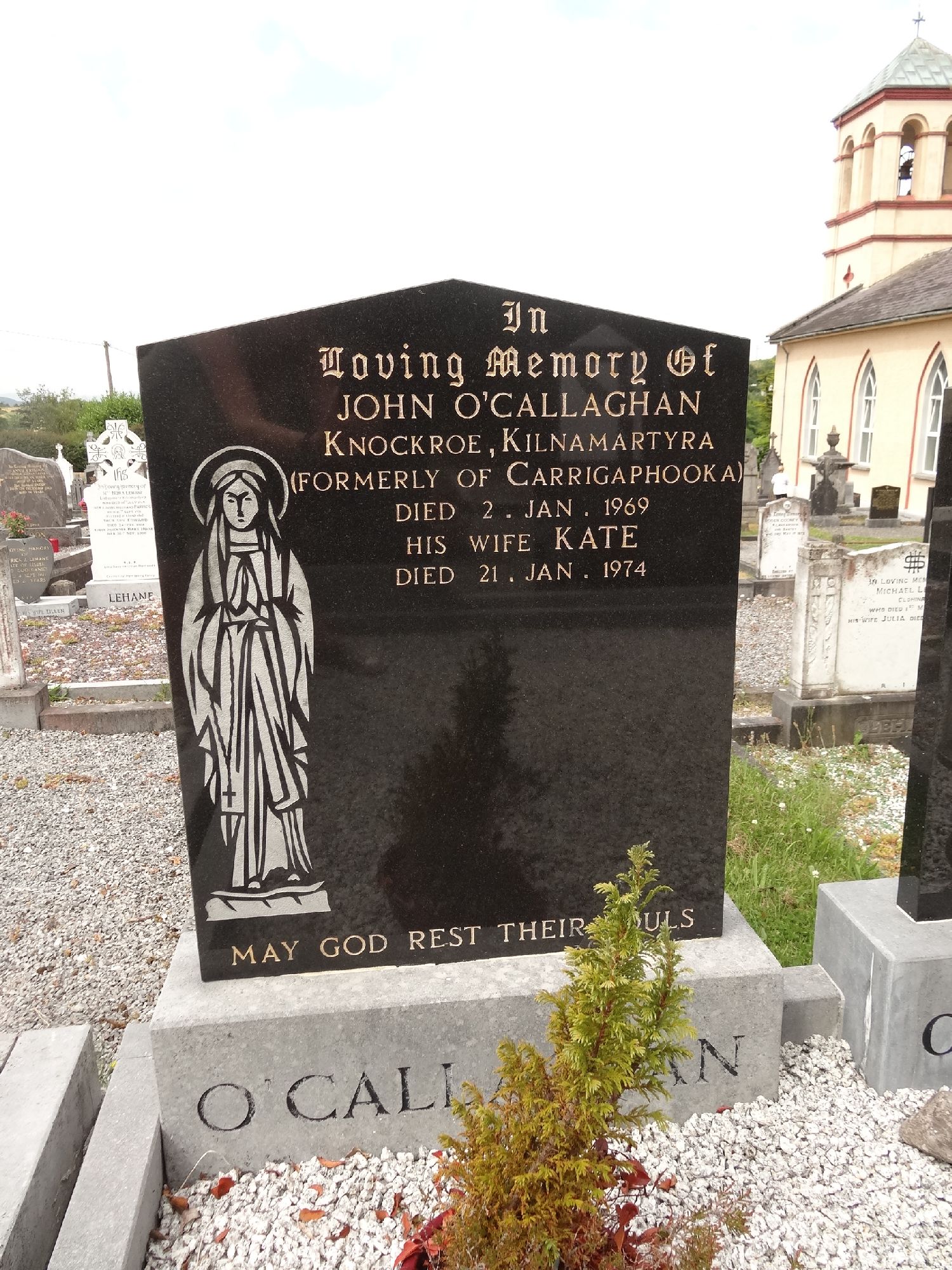 InLoving Memory of JOHN O'CALLAGHANKnockroe, Kilnamartyra(formerly of Carrigaphooka)Died 2. Jan. 1969His wife KATEDied 21. Jan. 1974