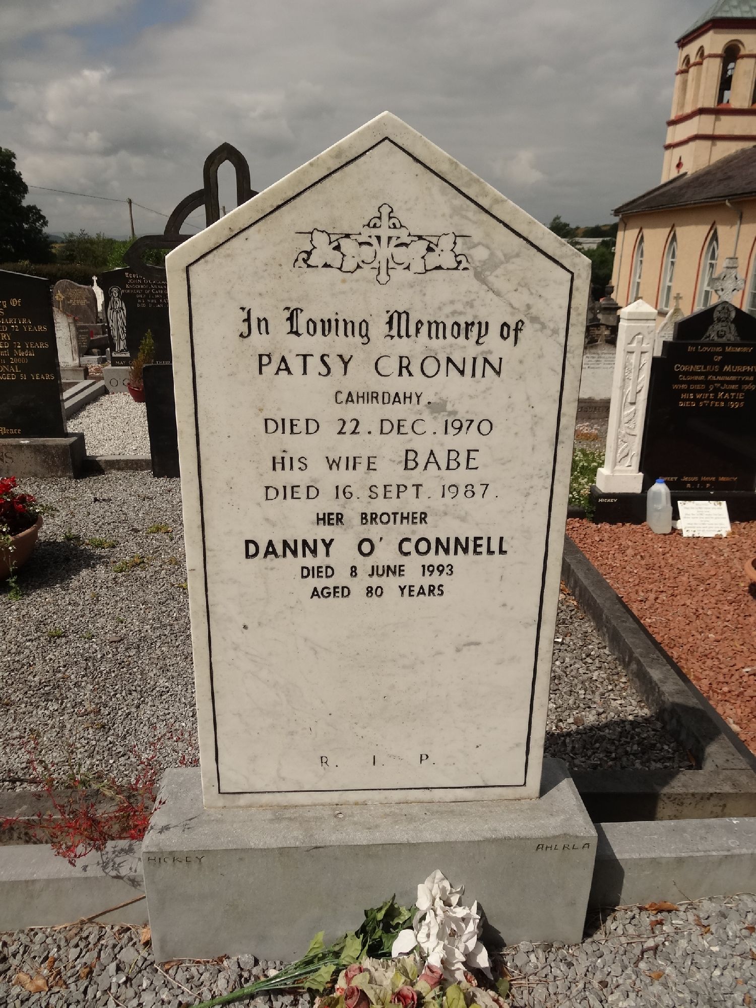 In Loving Memory ofPATSY CRONINCahirdahyDied 22. Dec. 1970His wife BABEDied 16. Sept. 1987Her brotherDANNY O'CONNELLDied 8 June 1993aged 80 yearsR.I.P.