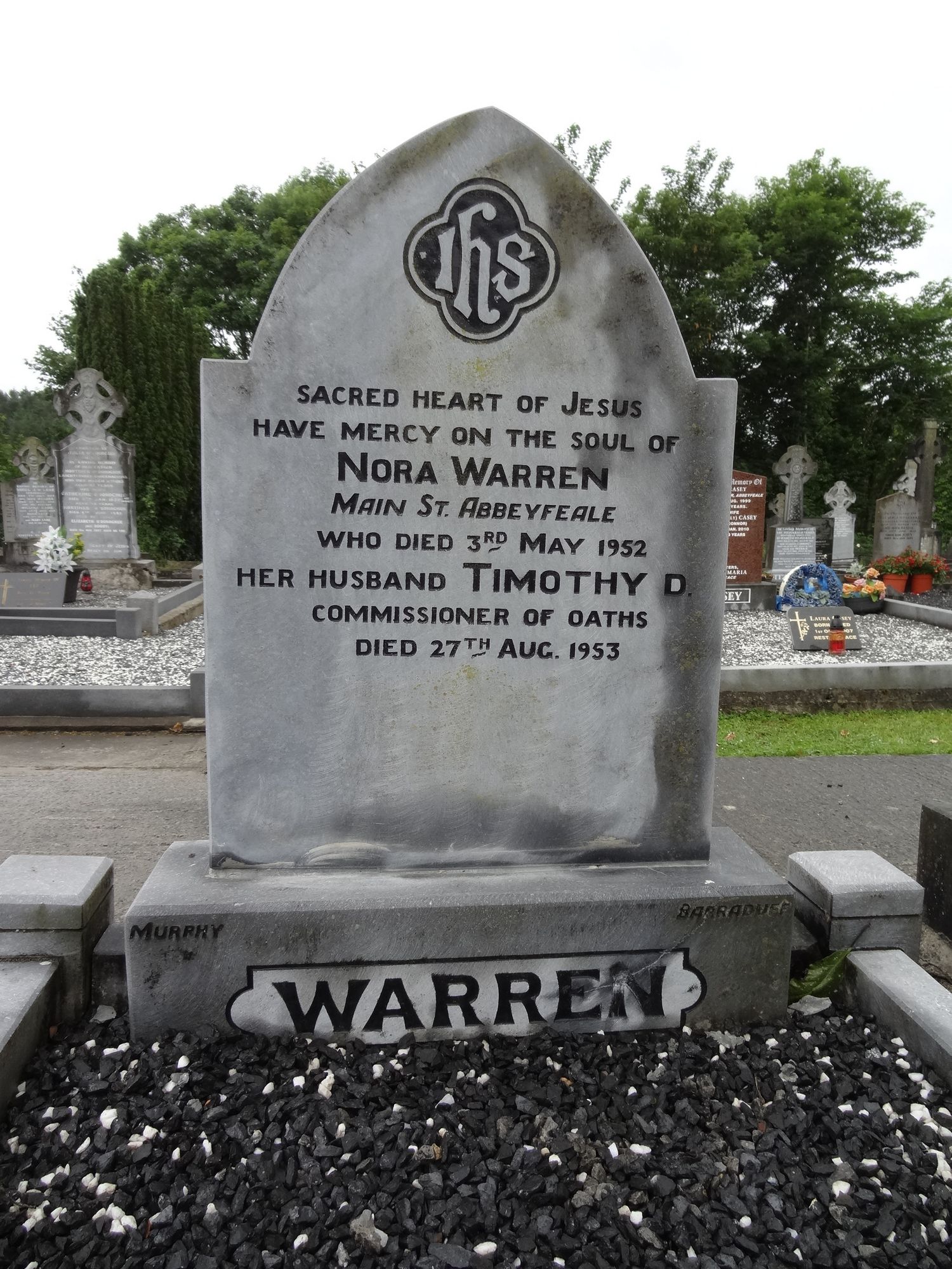 Sacred Heart of JesusHave Mercy On The Soul OfNORA WARRENMain St. AbbeyfealeWho Died 3RD May 1952Her Husband TIMOTHYCommissioner Of OathsDied 27TH Aug. 1953