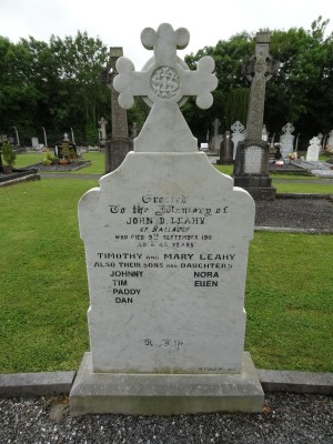 Erected To The Memory ofJOHN D. LEAHYOf BallaughWho Died 9TH September 1911Aged 40 YearsTIMOTHY And MARY LEAHYAlso Their Sons And DaughtersJOHNNY NORATIM ELLENPADDYDAN