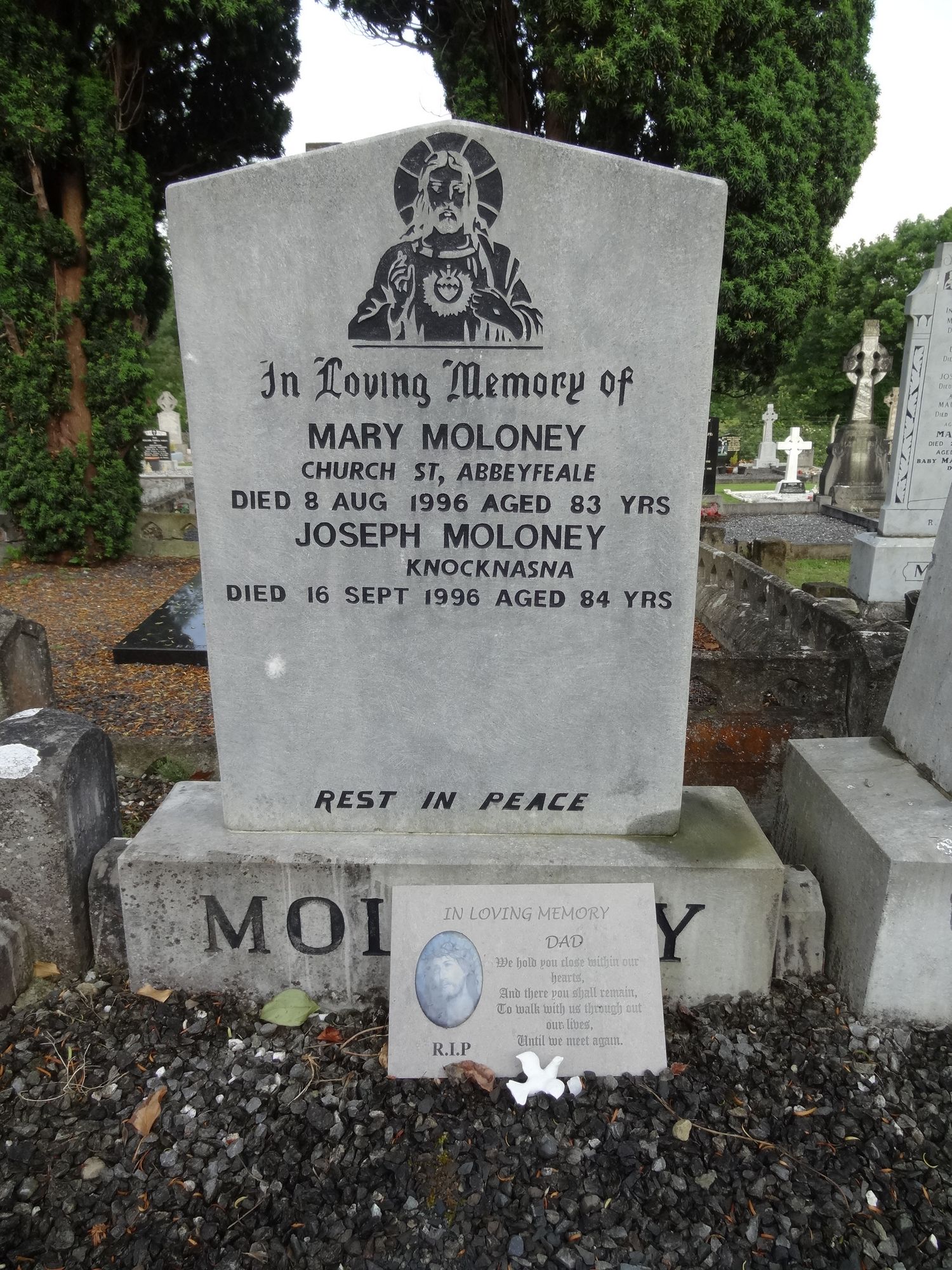 In Loving Memory ofMARY MOLONEYChurch St, AbbeyfealeDied 8 Aug 1996 Aged 83 YrsJOSEPH MOLONEYKnocknasnaDied 16 Sept 1996 Aged 84 Yrs