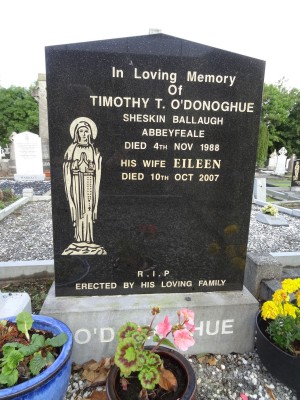In Loving MemoryOfTIMOTHY T. O'DONOGHUESheskin BallaughAbbeyfealeDied 4TH Nov 1988His Wife EILEENDied 10TH Oct 2007