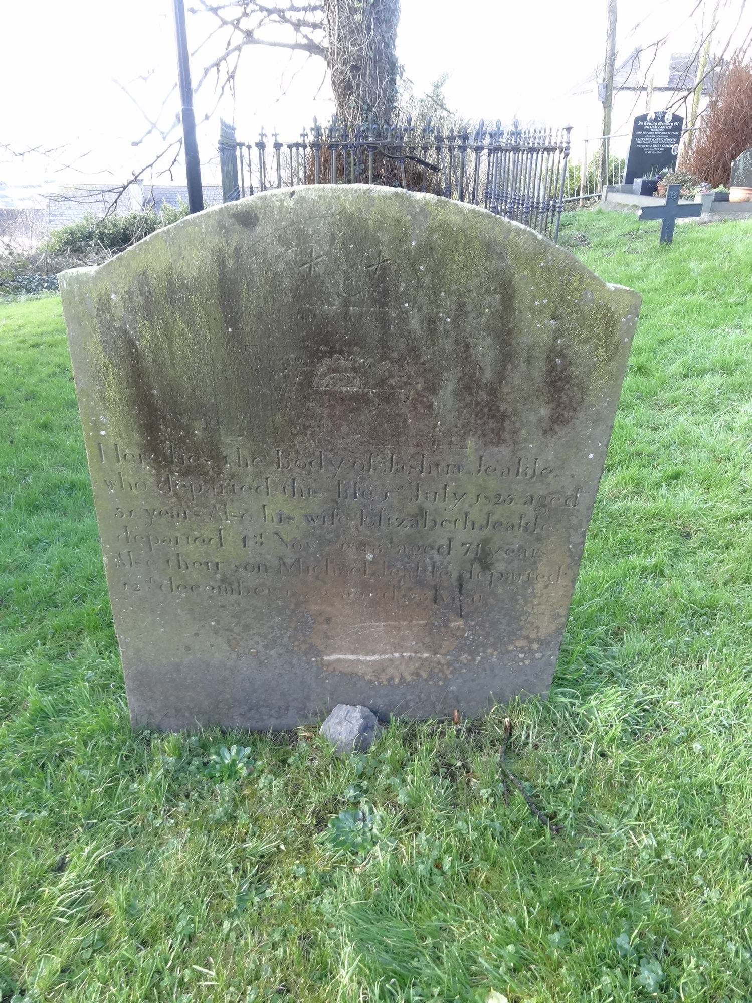 HERE LIES THE BODY OF JASHUA JEAKLEWHO DEPARTED THIS LIFE 1STJULY 1825 AGED51 YEARS. ALSO HIS WIFE ELIZABETH JEAKLEDEPARTED 1ST NOVEMBER 1845 AGED 71 YEARSALSO THEIR SON MICHAEL DEPARTED12TH DECEMBER 1832 AGED 25 YEARS