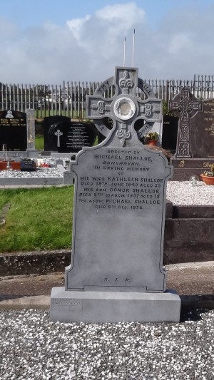 Erected By Michael Shalloe, Dungarvan In Loving Memory of His Wife Kathleen Shalloe Died 19th June 1949 Aged 53 His Son Conor Shalloe Died 8th March 1957 Aged 19 The Above Michael Shalloe Died 9th Dec. 1974.