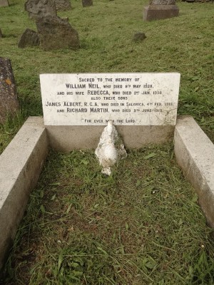 SACRED TO THE MEMORY OFWILLIAM NEIL WHO DIED 8TH MAY 1928AND HIS WIFE REBECCA, WHO DIED 2ND JAN 1938ALSO THEIR SONSJAMES ALBERT, R.G.A. WHO DIED IN SALONICA 4TH FEB 1916AND RICHARD MARTIN WHO DIED 9TH JUNE 1919"FOR EVER WITH THE LORD"