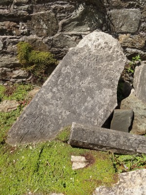 This headstone is propped upside down, face up against the back of the Galwey chapel