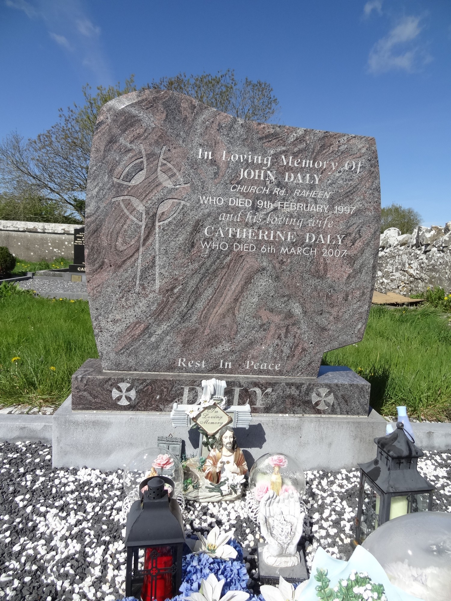 In Loving Memory OfJOHN DALYChurch Rd., RaheenWho Died 9th February 1997and his loving wifeCATHERINE DALYWho Died 6th March 2007