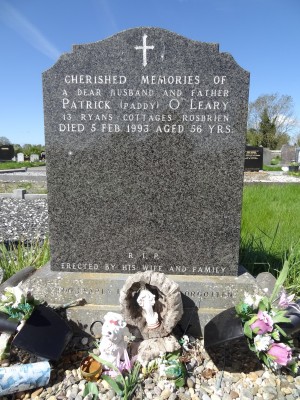 CHERISHED MEMORIES OFA Dear Husband And FatherPATRICK (PADDY) O' LEARY13 Ryans Cottages RosbrienDied 5 Feb. 1993 Aged 56 Yrs.