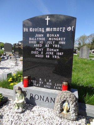 In Loving Memory OfJOHN RONANBallynoe MungretDied 10 July 1981Aged 63 Yrs.MAY RONANDied 5 June 1987Aged 68 Yrs.