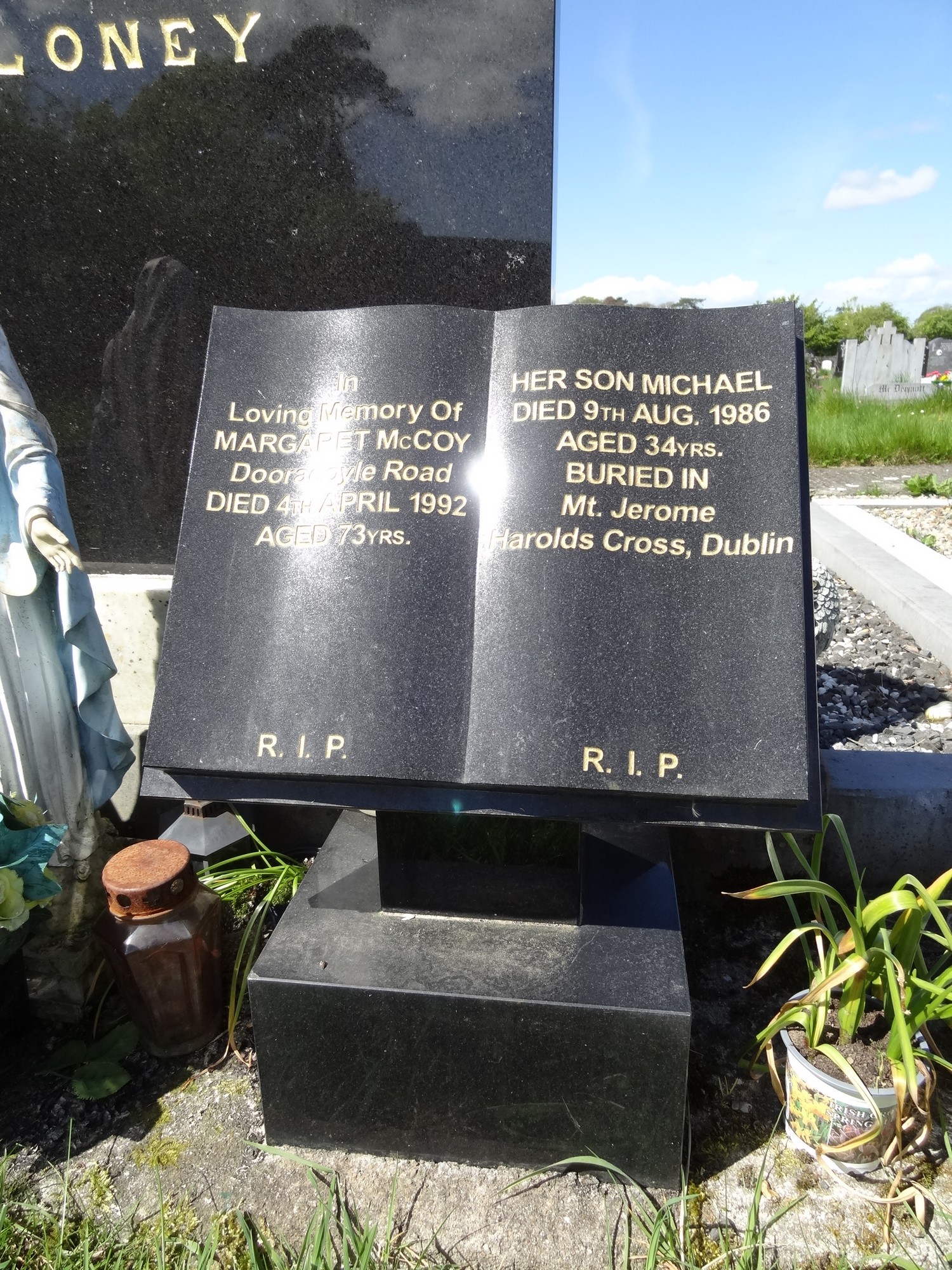 {right side inscription}HER SON MICHAELDIED 9TH AUG. 1986AGED 34 YRS.BURIED INMt. JeromeHarolds Cross, Dublin