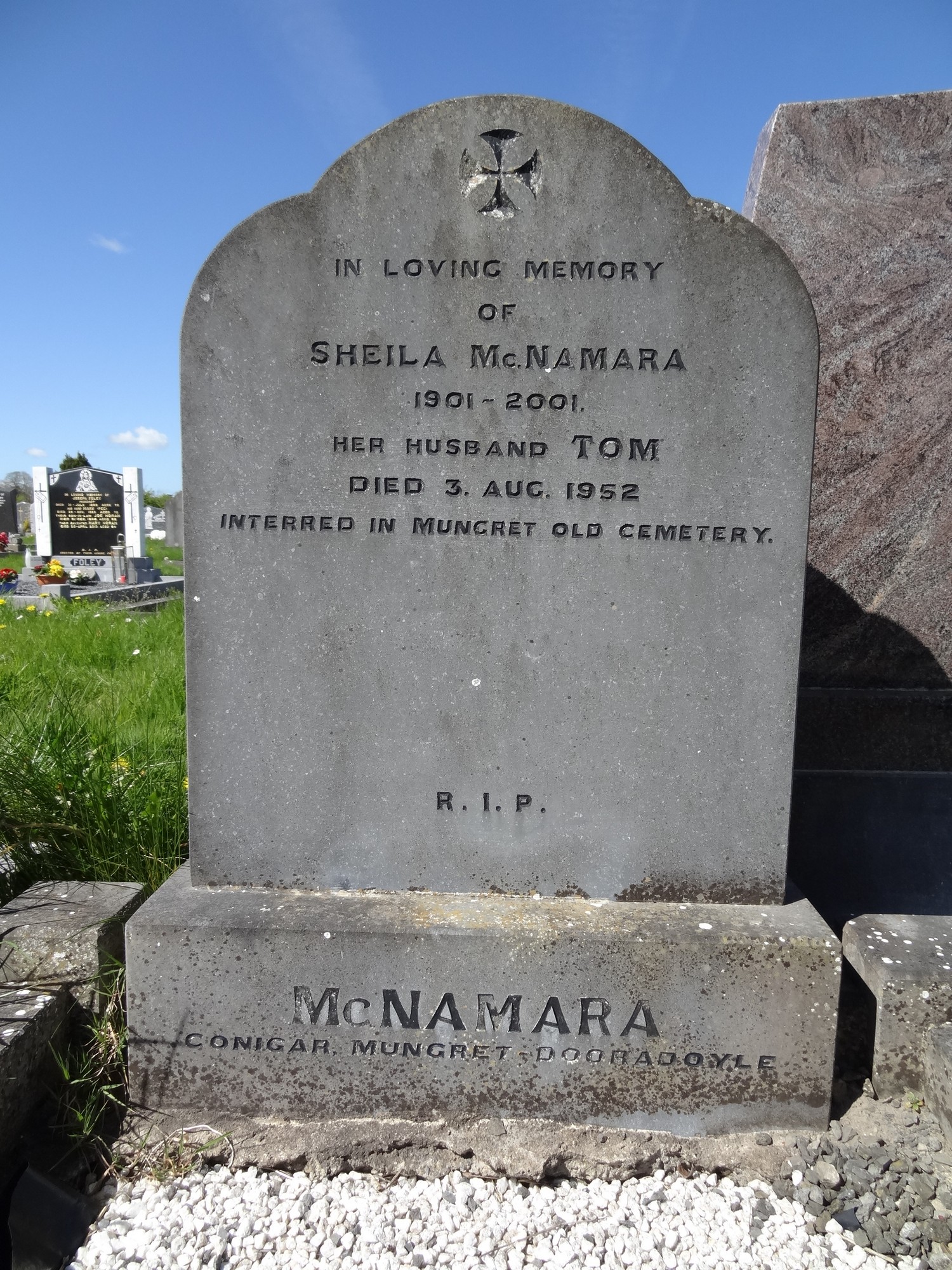 In Loving MemoryOfSHELIA McNAMARA1901 - 2001.Her Husband TOMDied 3. Aug. 1952Interred In Mungret Old Cemetery.
