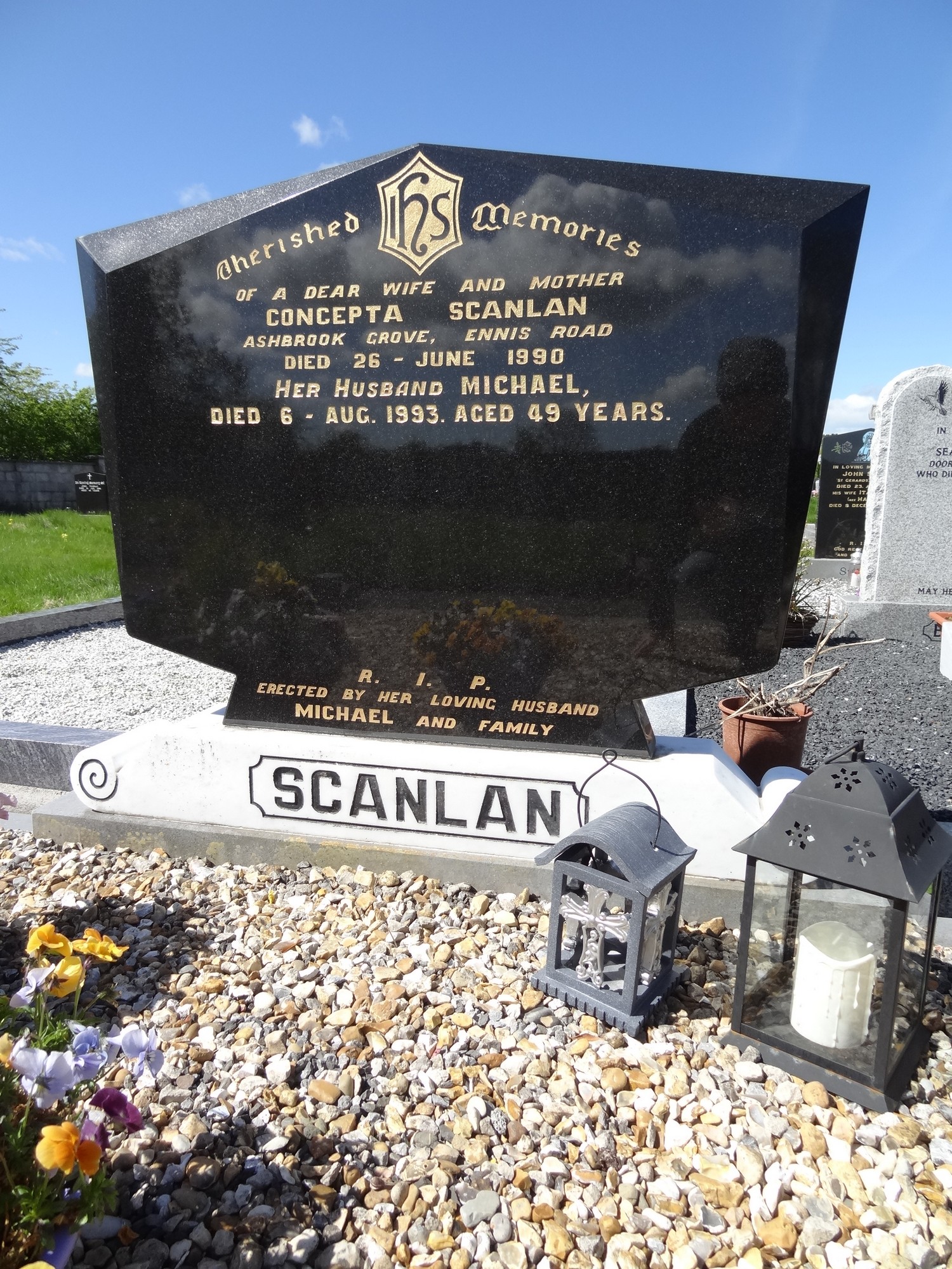 Of A Dear Wife And MotherCONCEPTA SCANLANAshbrook Grove, Ennis RoadDied 26 - June 1990Her Husband MICHAEL,Died 6 - Aug. 1993. Aged 49 Years.
