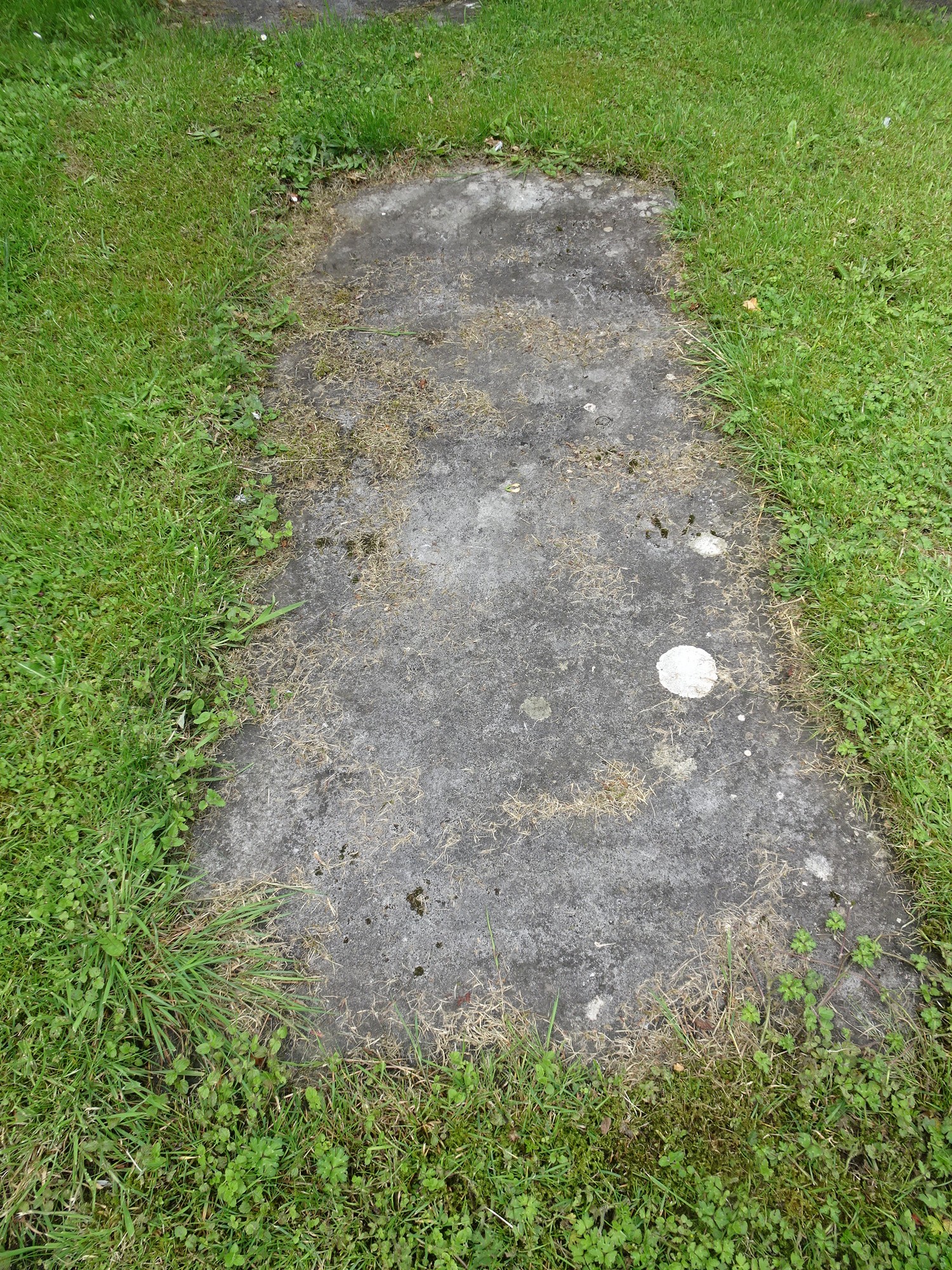 A Rect. slab with a curved, almost triangular top and Inc'd. two-line border and Ins.. A rough kerb of ashlar blocks (some displaced) occurs around part of this stone. This, which was uncovered in 1990, is now grassed over. See also Nos. 154, 262, 403 and XI for other Stephens.
