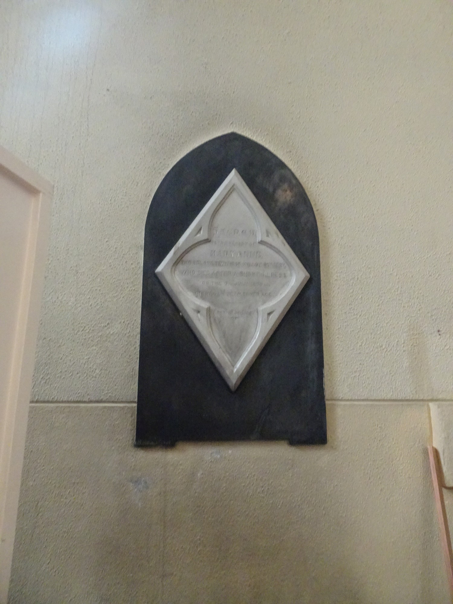 A wall monument of the same form as No. 283, but without a motto scroll. The lozenge-shaped plaque is of white marble, the backing plaque is of black limestone. The words "FRANKLIN MARBLE WORKS" and "GALWAY" occur at the base of the backing plaque. The actual burial place is in the graveyard. (See No. 141)