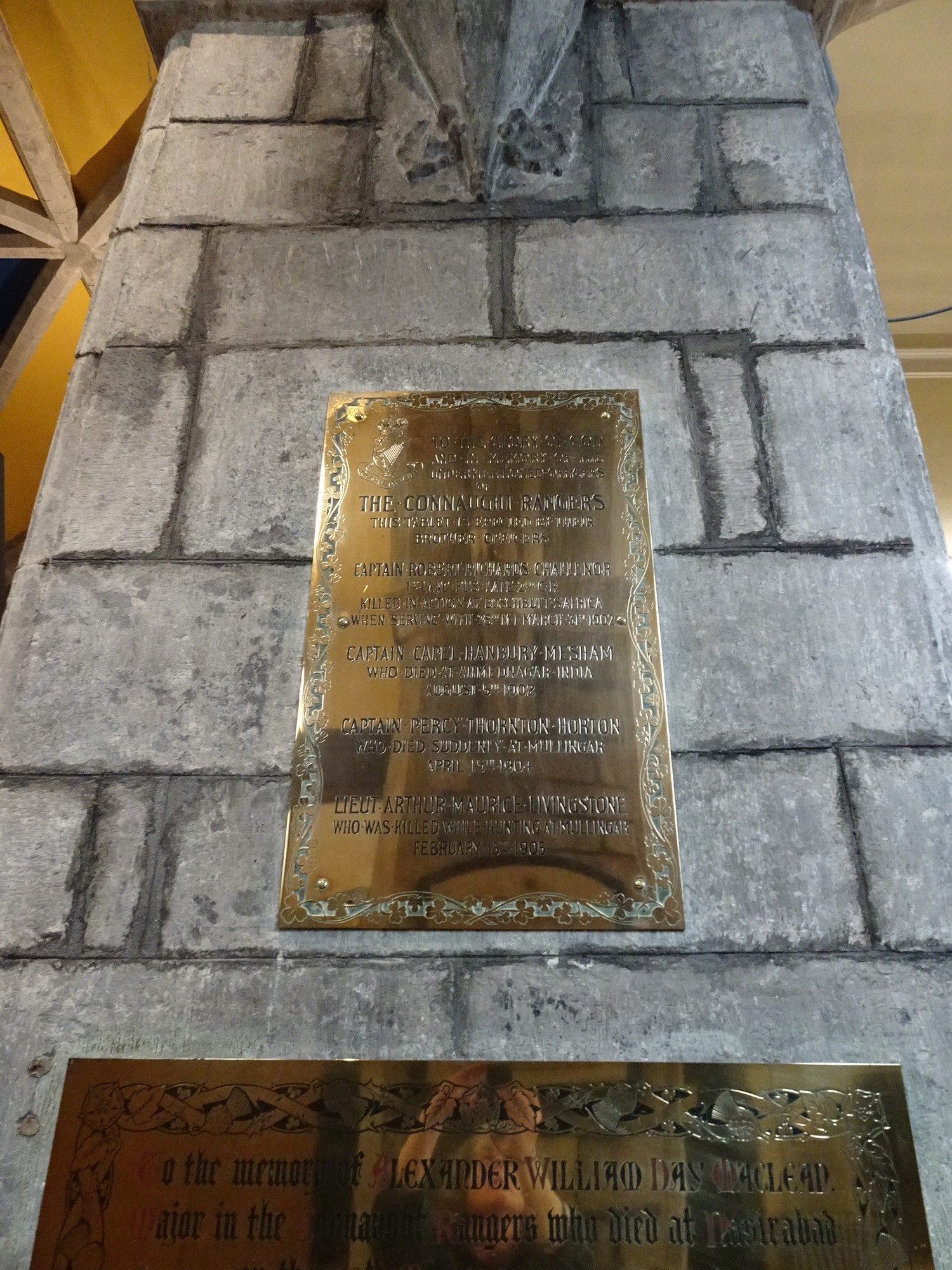 TO • THE * GLORY • OF • GOD AND • IN • MEMORY • OF • THE UNDERMENTIONED • OFFICERS OF THE • CONNAUGHT • RANGERS THIS • TABLET • IS • ERECTED • BY • THEIR BROTHER OFFICERS CAPTAIN • ROBERT • RICHARDS • CHALLENOR 1ST LANC FUS LATE 2ND c R. KILLED • IN • ACTION • AT • BOSCHBULT • S • AFRICA WHEN • SERVING • WITH • 28th -MI- MARCH • 31st • 1902 CAPTAIN • CAPEL • HANBURY • MESHAM WHO • DIED • AT • AHMEDNAG AR • INDIA AUGUST-5TH-1902 CAPTAIN * PERCY • THORNTON • HORTON WHO * DIED • SUDDENLY • AT • MULLINGAR APRIL* 15th-1904 LIEUT ARTHUR MAURICE LIVINGSTON WHO • WAS • KILLED • WHILE • HUNTING • AT • MULLINGAR FEBRUARY-15™-1905