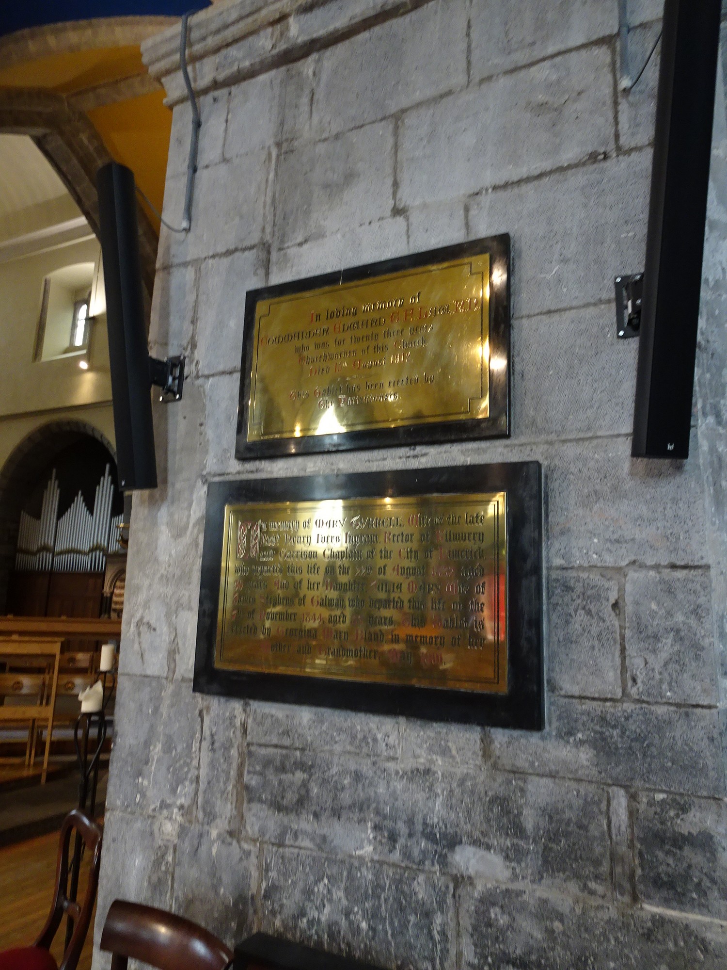 A brass plaque on a white marble background, held together by the means of four screws. The Ins. is inlaid in black with the capitals in red. The name of the metalworking company "T.R. SCOTT & C°. LTD. DUBLIN" is on the left hand comer of the plaque. The lettering is a mixture of pseudo-Gothic and Lombardic script.