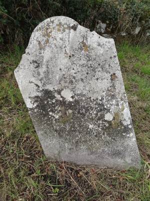 Stone is very badly worn, there is some decoration on the top – possible I H S with the H surmounted by a Cross. Incised lettering also very faint.
