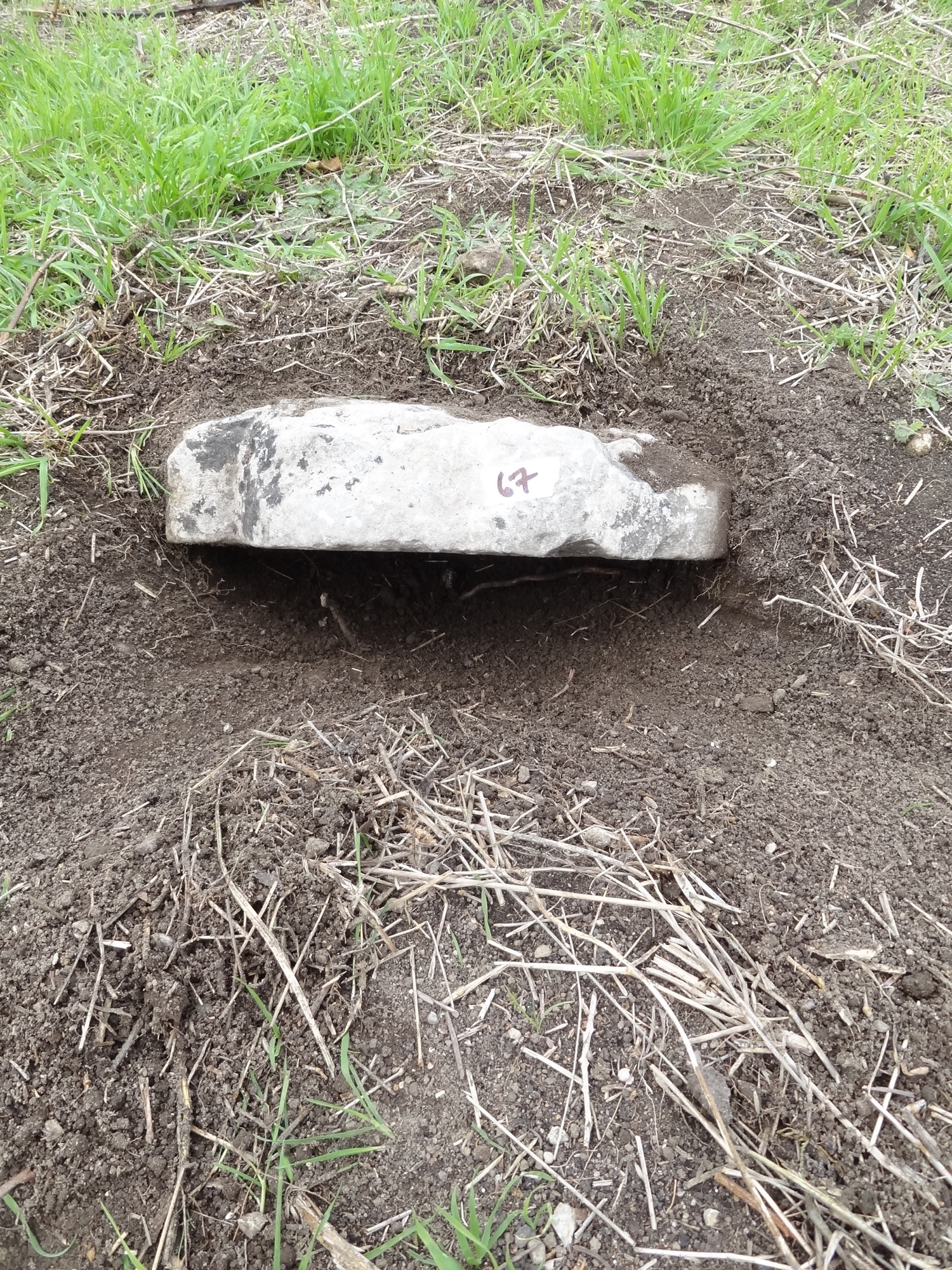 Description: Very decorative head and writing: Top of stone – in relief – roman I H S, with Omega forming the bar of the H, which is surmounted by a Cross, the terminals are Nail shaped (signifying the Crucifixion), there is a floral design above and around the Cross. Beneath the H is a Heart, on each shoulder there is a Daisy flower signifying innocence. The incised inscription is in very decorative Cursive script.
