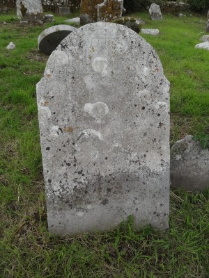 Description: top of stone - in false relief – I H S, large H surmounted with an Ionic Cross, beneath the H there in an Inverted Heart, all are enclosed in a circle. On each shoulder there is a floral design. There may be other illegible decoration. The incised inscription is difficult to read.