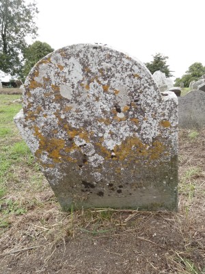 Description: Head of stone – in relief – roman I H S with Omega forming the bar of the H which is surmounted by a Cross with nail terminals, on each side of the Cross there is circular flower. On each shoulder there is a inverted Heart. All are enclosed in a semi-Sunburst around the head. The incised inscription panel in enclosed in a incised double border. The epitaph is written in roman capitals and lower case with serifs.