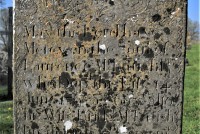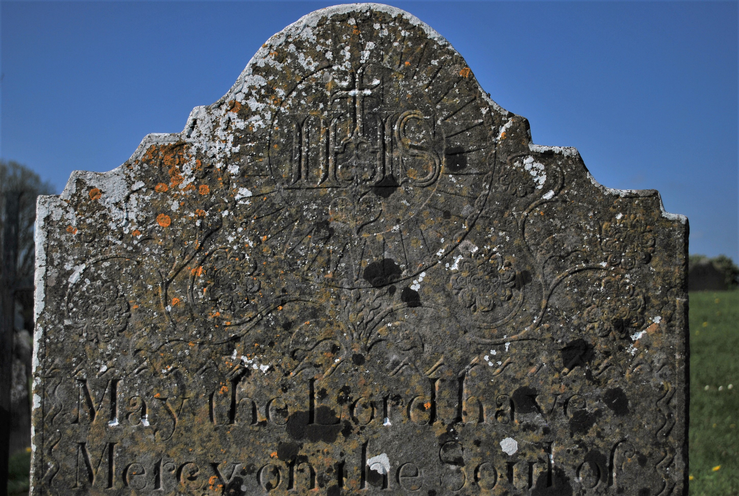 Description: Head of stone – very decorative – in relief – roman I H S with Omega forming the bar of the H which is surmounted by a Cross with Nail terminals, beneath the H are two Hearts – one inverted, all are enclosed in a full Sunburst in a decorative circle, beneath this, sprouting from the middle of the panel, onto each shoulder, are two Trees of Life. The epitaph panel is enclosed in a wave pattern border. The inscription is in early roman capitals and lower case.