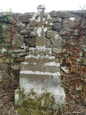 Headstone in limestone in 5 sections – with a Celtic revival Cross on top. The gravestone is enclosed in a cast-iron railing on 3 sides. The railings are painted black.