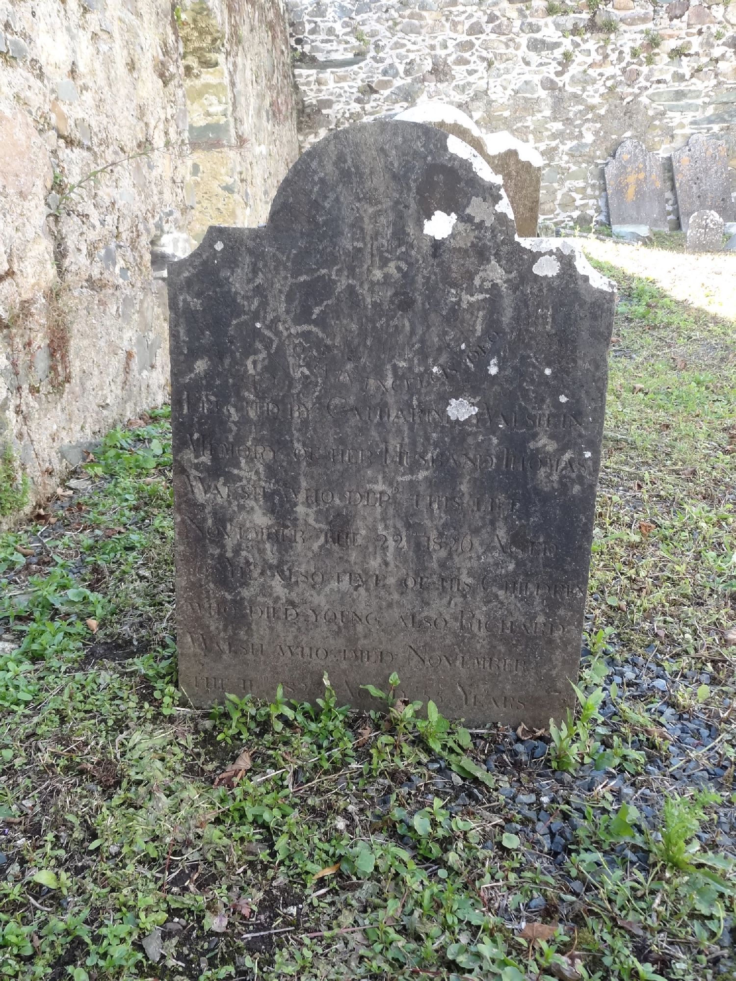 Erected by Catharine Walsh in memory of her husbandThomas Walsh who departed this life November the 22nd 1826 aged 36 yearsAlso five of his children who died young Also Richard Walsh who died November the 11th 1823 aged 55 yearsÂ