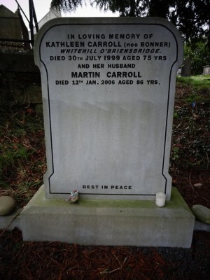 In Loving Memory Kathhleen Carroll (nee Bonner) Whitehall O' Briensbridge Died 30th July 1999 Aged 75 Yrs And her Husband Martin Carroll Died 12th Jan,2006 aged 86 Yrs
