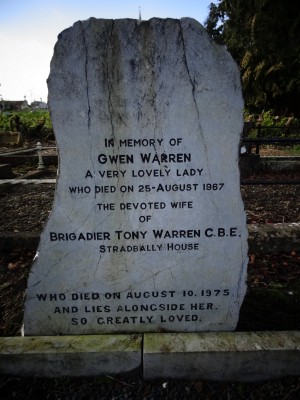 In memory of Gwen Warren A very lovely Lady who died on 25-August 1967 The devoted wife of Brigadier Tony Warren C.B.E. Stradbally House who died on August 10. 1975 and hes alongside her. so greatly loved.