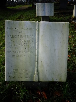 IN LOVING MEMORY OF FRANCIS HARTIGAN DIED 8 OCT 1978 HIS SON GORDON DIED 23 JULY 1966 DUE TO AN ACCIDENT IN ENGLAND