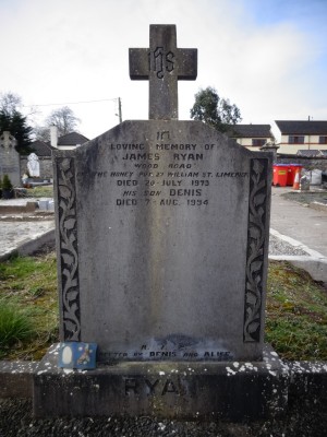 IN LOVING MEMORY OF JAMES RYAN WOOD ROAD AND THE HONEYPOT 29 WILLIAM ST. LIMERICK DIED 20-JULY 1973 HIS SON DENIS DIED 7-AUG. 1994