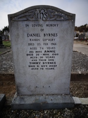 In loving memory of Daniel Byrnes Raheen, Lisnagry died 23 Feb 1966 aged 74 years his wife Annie died 20-Nov 1980 aged 90 years and their son Timmy Byrnes died 6. Nov 2007 aged 72 years R.I.P.