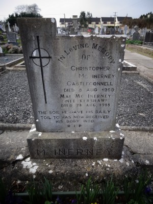 In loving memory of Christopher McInerney Castleconnell died 8 Aug 1969 Mai McInerney (nee Kershaw) died 28 Aug 1988 The soil he gave his daily toil to has now received his body into R.I.P.