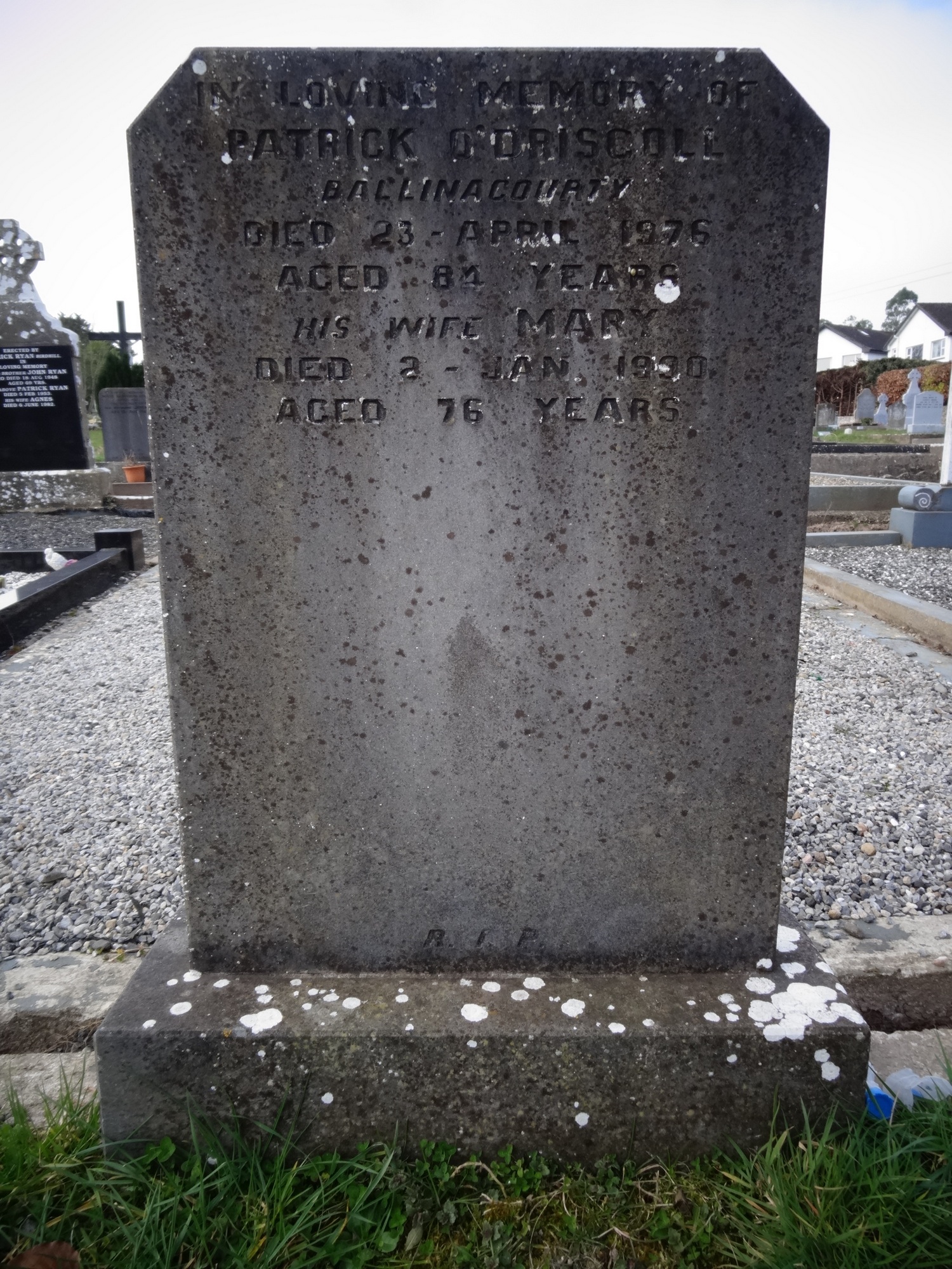 IN LOVING MEMORY OF PATRICK O' DRISCOLL BALLINACOURTY DIED 23-APRIL 1975 AGED 84 YEARS HIS WIFE MARY DIED 2-JAN. 1990 AGED 76 YEARS