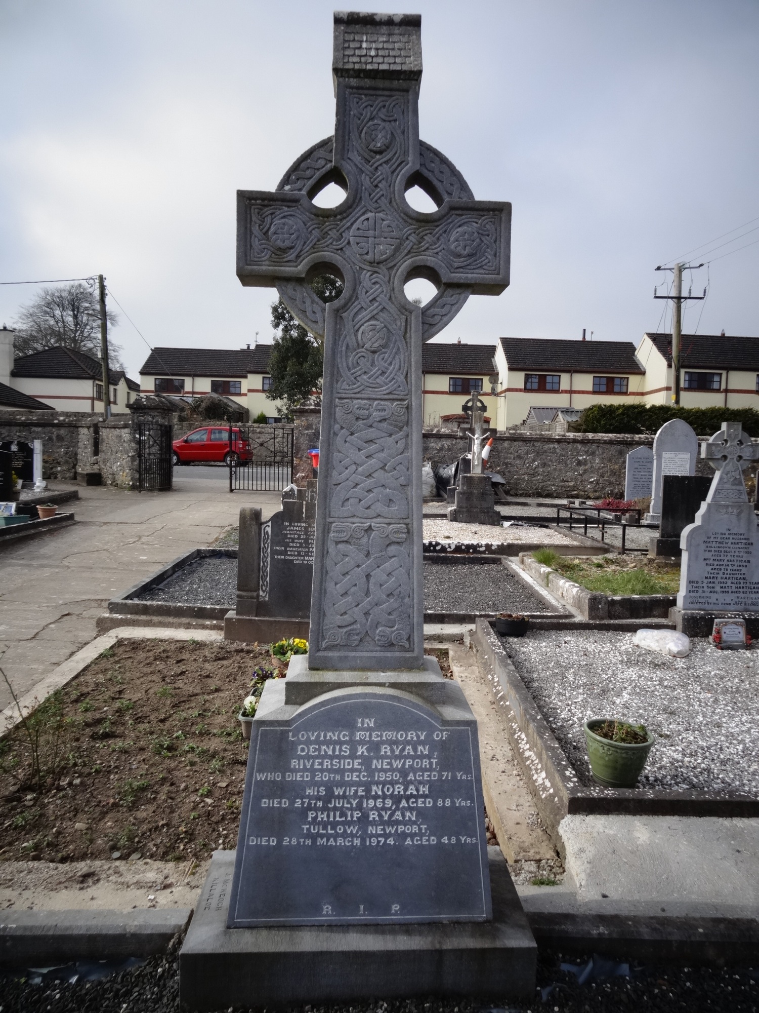 In loving memory of Dennis K Ryan, Riverside, Newport, who died 20th Dec 1950, aged 71yrs his wife Norah, died 27th July 1969, aged 88yrs Philip Ryan Tullow, Newport, died 28th March 1974, aged 48 yrs R.I.P.