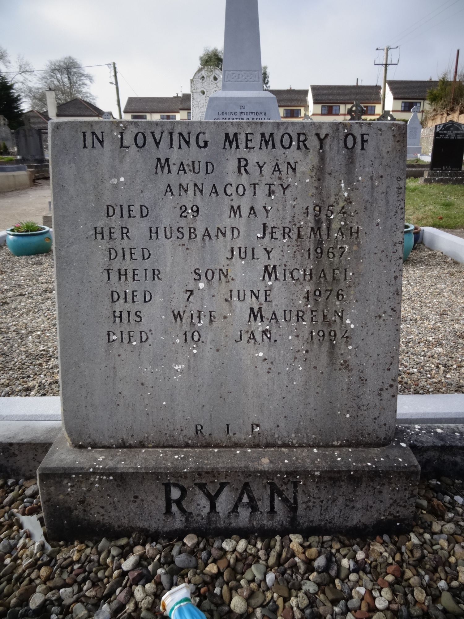 In loving memory of Maud Ryan died 29 May 1954 her husband Jeremiah died July 1967 their son Michael died 7 June 1976 his wife Maureen died 10 Jan 1994