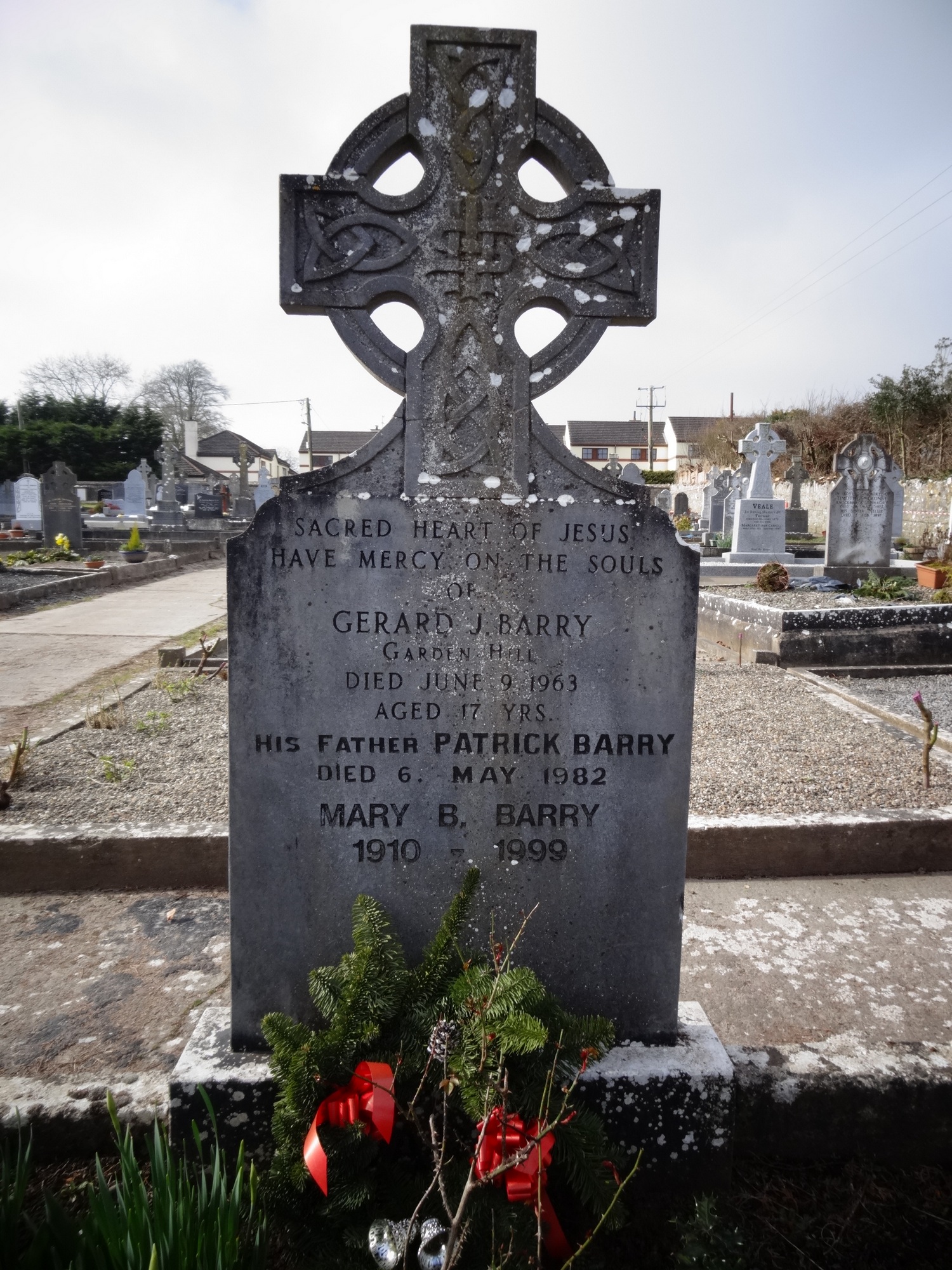 Sacred heart of Jesus Have mercy on the souls of Gerard J Barry Garden Hill died June 9 1963 Aged 17 yrs. His Father Patrick Barry died 6 May 1982 Mary B Barry 1910-1999