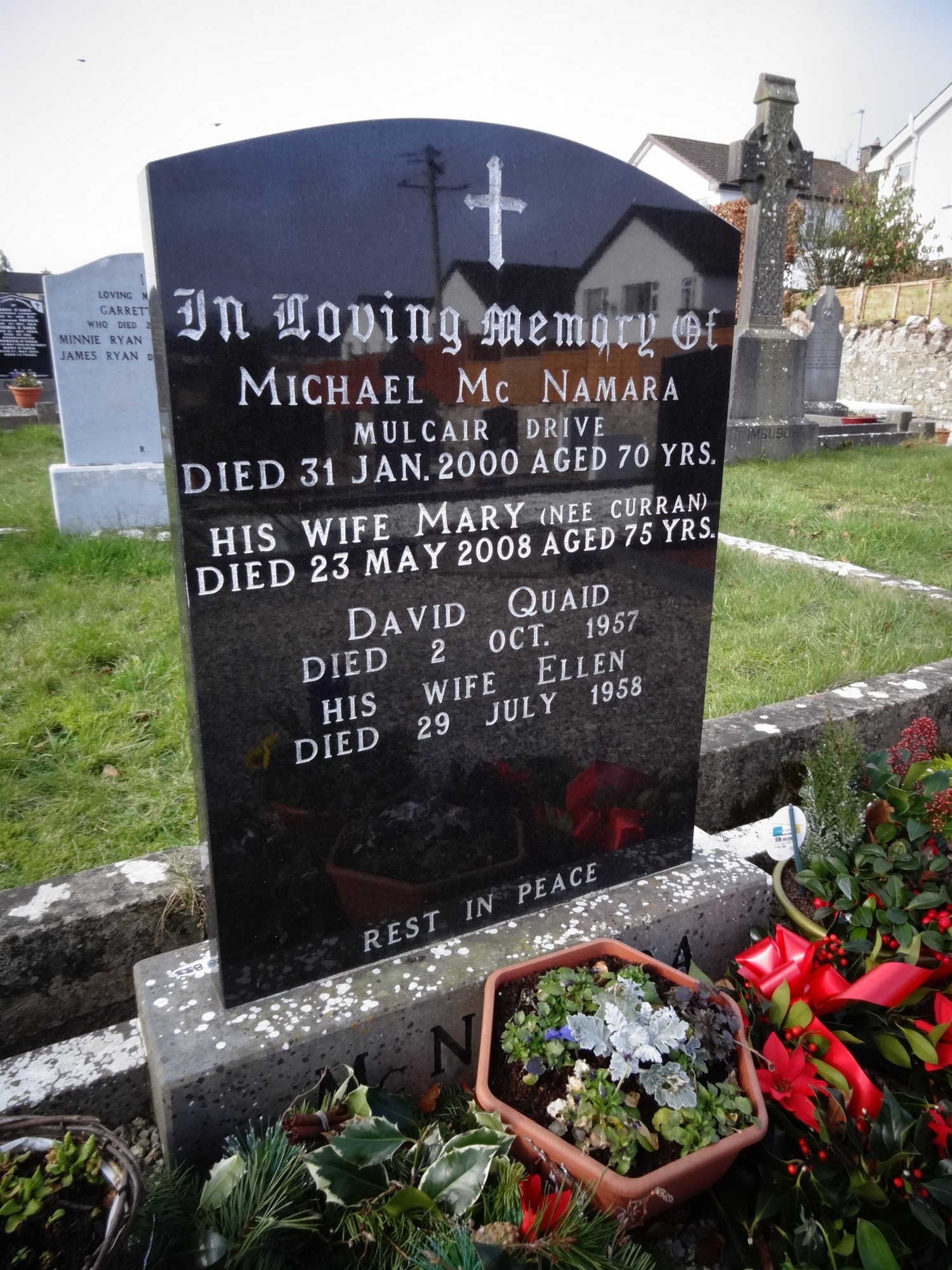 IN LOVING MEMORY OF MICHAEL McNAMARA MULCAIR DRIVE DIED 31 JAN. 2000 AGED 70 YRS. HIS WIFE MARY (NEE CURRAN) DIED 23 MAY 2008 AGED 75 YRS. DAVID QUADE DIED 2 OCT. 1957 HIS WIFE ELLEN DIED 29 JULY 1958